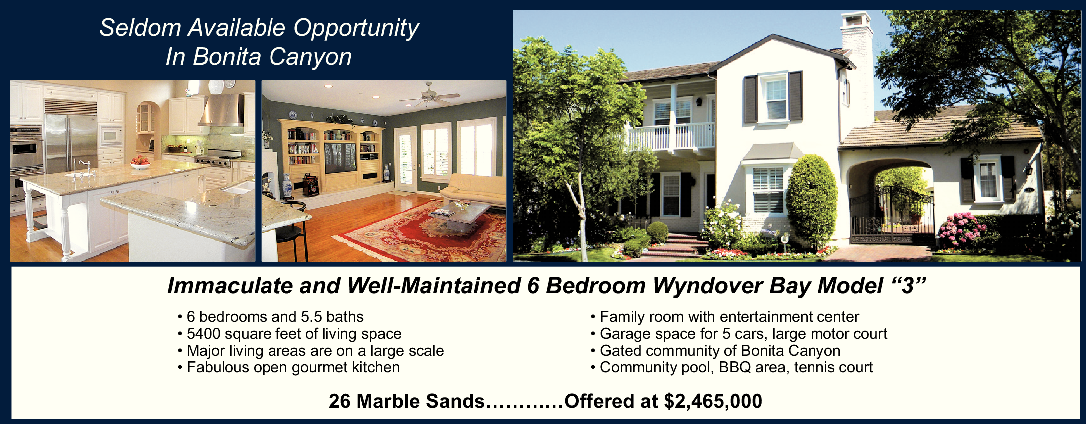 • Family room with entertainment center • Garage space for 5 cars, large motor court • Gated community of Bonita Canyon • Community pool, BBQ area, tennis court