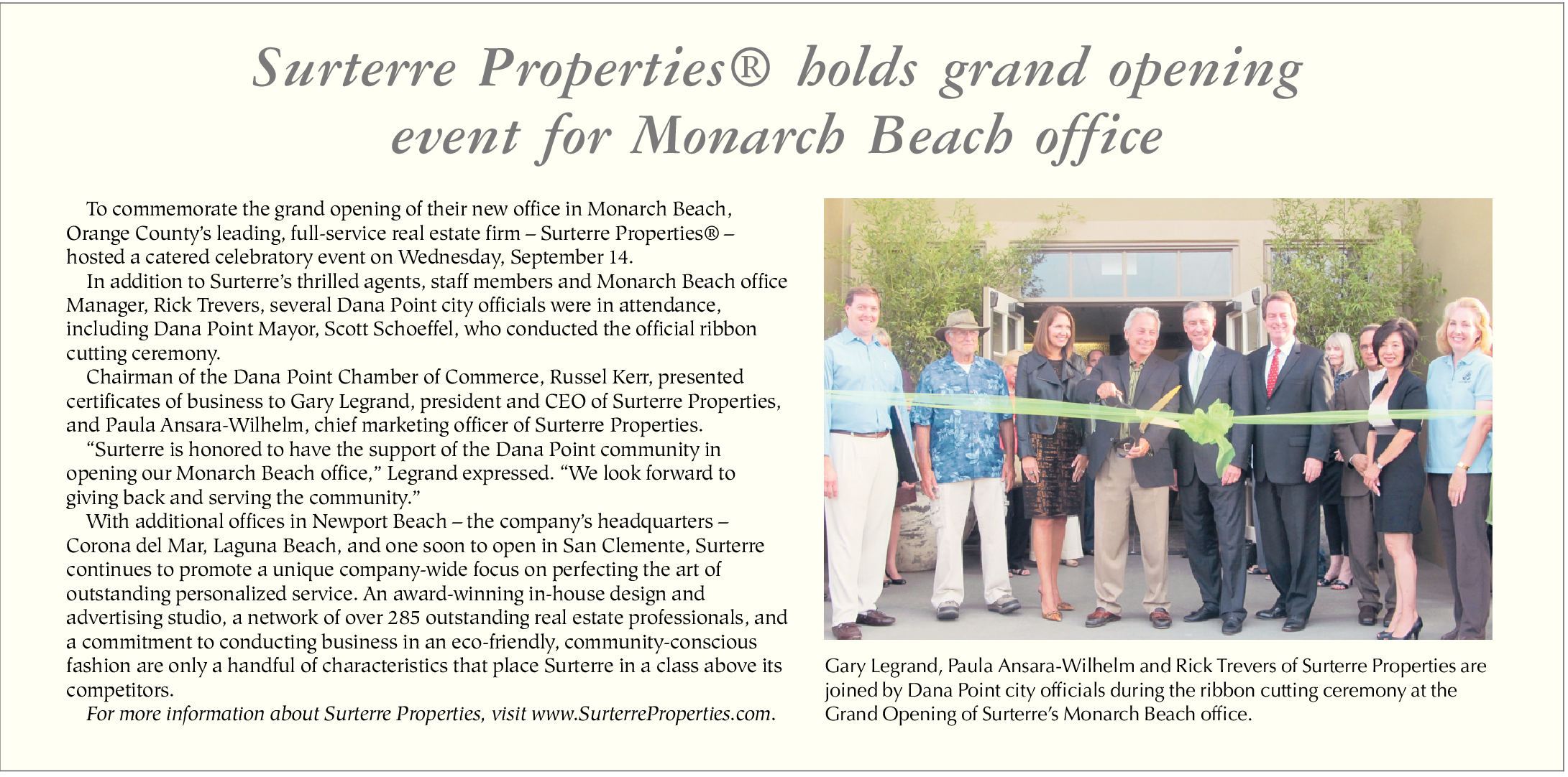To commemorate the grand opening of their new office in Monarch Beach, Orange County’s leading, full-service real estate firm – Surterre Properties® – hosted a catered celebratory event on Wednesday, September 14.