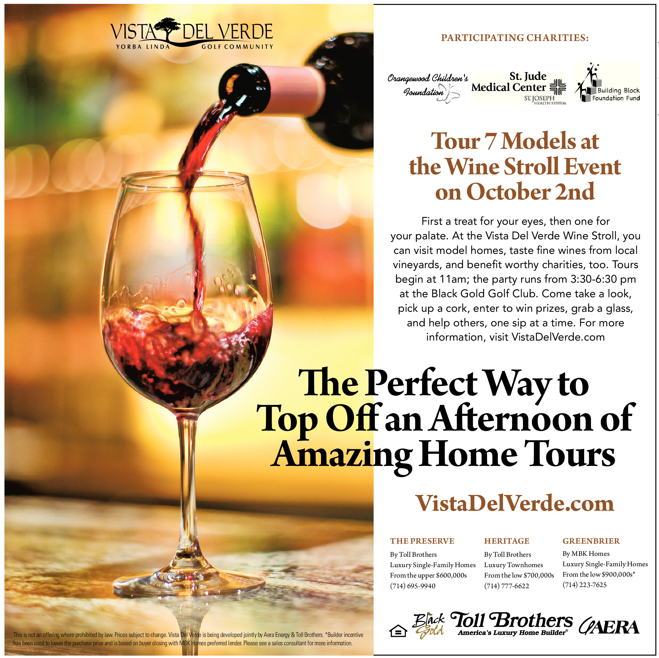 This is not an offering where prohibited by law. Prices subject to change. Vista Del Verde is being developed jointly by Aera Energy & Toll Brothers. *Builder incentive has been used to lower the purchase price and is based on buyer closing with MBK Homes preferred lender. Please see a sales consultant for more information.
