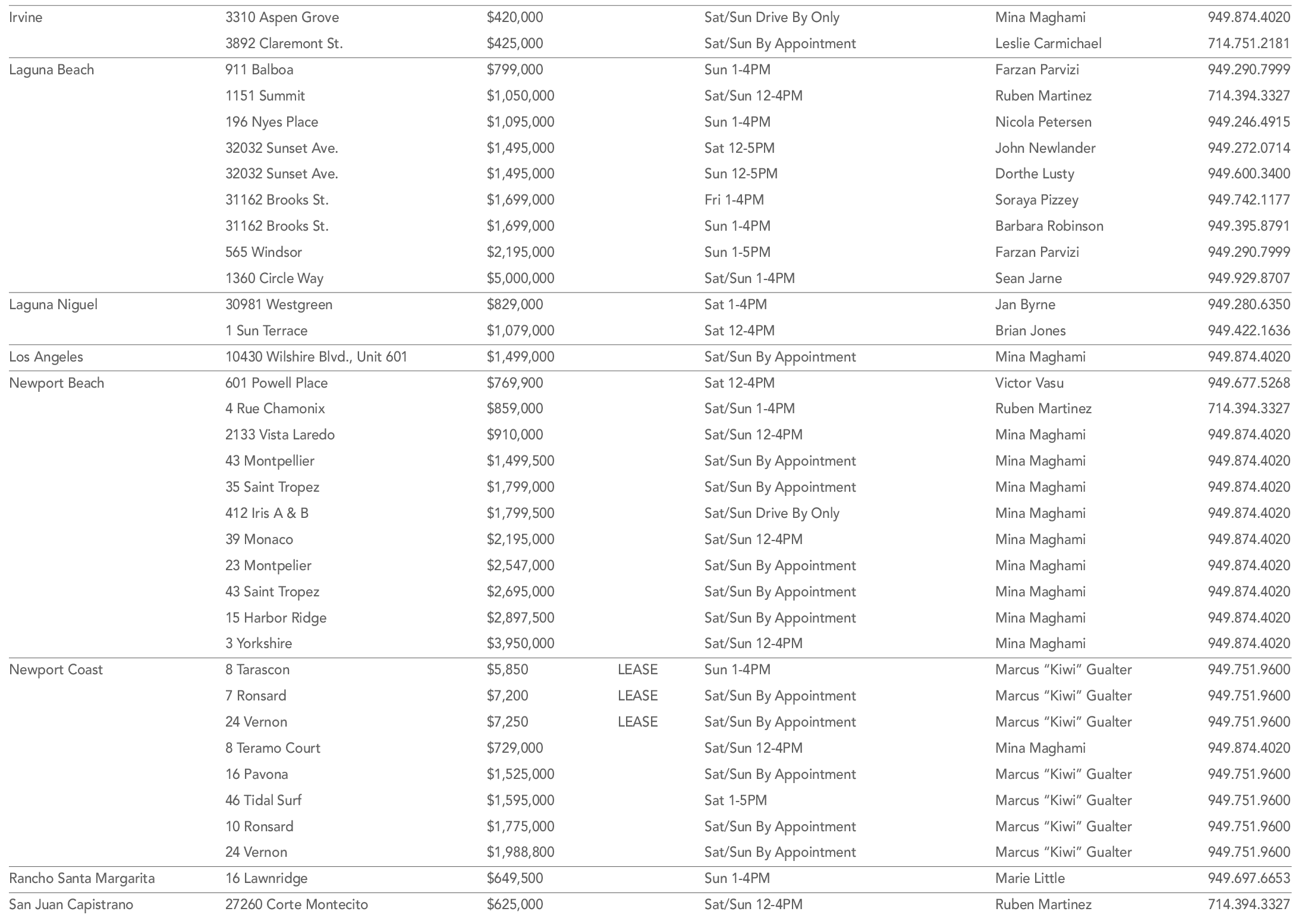 Irvine 3310 Aspen Grove $420,000 Sat/Sun Drive By Only Mina Maghami 949.874.4020 3892 Claremont St. $425,000 Sat/Sun By Appointment Leslie Carmichael 714.751.2181 Laguna Beach 911 Balboa $799,000 Sun 1-4PM Farzan Parvizi 949.290.7999 1151 Summit $1,050,000 Sat/Sun 12-4PM Ruben Martinez 714.394.3327 196 Nyes Place $1,095,000 Sun 1-4PM Nicola Petersen 949.246.4915 32032 Sunset Ave. $1,495,000 Sat 12-5PM John Newlander 949.272.0714 32032 Sunset Ave. $1,495,000 Sun 12-5PM Dorthe Lusty 949.600.3400 31162 Brooks St. $1,699,000 Fri 1-4PM Soraya Pizzey 949.742.1177 31162 Brooks St. $1,699,000 Sun 1-4PM Barbara Robinson 949.395.8791 565 Windsor $2,195,000 Sun 1-5PM Farzan Parvizi 949.290.7999 1360 Circle Way $5,000,000 Sat/Sun 1-4PM Sean Jarne 949.929.8707 Laguna Niguel 30981 Westgreen $829,000 Sat 1-4PM Jan Byrne 949.280.6350 1 Sun Terrace $1,079,000 Sat 12-4PM Brian Jones 949.422.1636 Los Angeles 10430 Wilshire Blvd., Unit 601 $1,499,000 Sat/Sun By Appointment Mina Maghami 949.874.4020 Newport Beach 601 Powell Place $769,900 Sat 12-4PM Victor Vasu 949.677.5268 4 Rue Chamonix $859,000 Sat/Sun 1-4PM Ruben Martinez 714.394.3327 2133 Vista Laredo $910,000 Sat/Sun 12-4PM Mina Maghami 949.874.4020 43 Montpellier $1,499,500 Sat/Sun By Appointment Mina Maghami 949.874.4020 35 Saint Tropez $1,799,000 Sat/Sun By Appointment Mina Maghami 949.874.4020 412 Iris A & B $1,799,500 Sat/Sun Drive By Only Mina Maghami 949.874.4020 39 Monaco $2,195,000 Sat/Sun 12-4PM Mina Maghami 949.874.4020 23 Montpelier $2,547,000 Sat/Sun By Appointment Mina Maghami 949.874.4020 43 Saint Tropez $2,695,000 Sat/Sun By Appointment Mina Maghami 949.874.4020 15 Harbor Ridge $2,897,500 Sat/Sun By Appointment Mina Maghami 949.874.4020 3 Yorkshire $3,950,000 Sat/Sun 12-4PM Mina Maghami 949.874.4020 Newport Coast 8 Tarascon $5,850 LEASE Sun 1-4PM Marcus “Kiwi” Gualter 949.751.9600 7 Ronsard $7,200 LEASE Sat/Sun By Appointment Marcus “Kiwi” Gualter 949.751.9600 24 Vernon $7,250 LEASE Sat/Sun By Appointment Marcus “Kiwi” Gualter 949.751.9600 8 Teramo Court $729,000 Sat/Sun 12-4PM Mina Maghami 949.874.4020 16 Pavona $1,525,000 Sat/Sun By Appointment Marcus “Kiwi” Gualter 949.751.9600 46 Tidal Surf $1,595,000 Sat 1-5PM Marcus “Kiwi” Gualter 949.751.9600 10 Ronsard $1,775,000 Sat/Sun By Appointment Marcus “Kiwi” Gualter 949.751.9600 24 Vernon $1,988,800 Sat/Sun By Appointment Marcus “Kiwi” Gualter 949.751.9600 Rancho Santa Margarita 16 Lawnridge $649,500 Sun 1-4PM Marie Little 949.697.6653 San Juan Capistrano 27260 Corte Montecito $625,000 Sat/Sun 12-4PM Ruben Martinez 714.394.3327