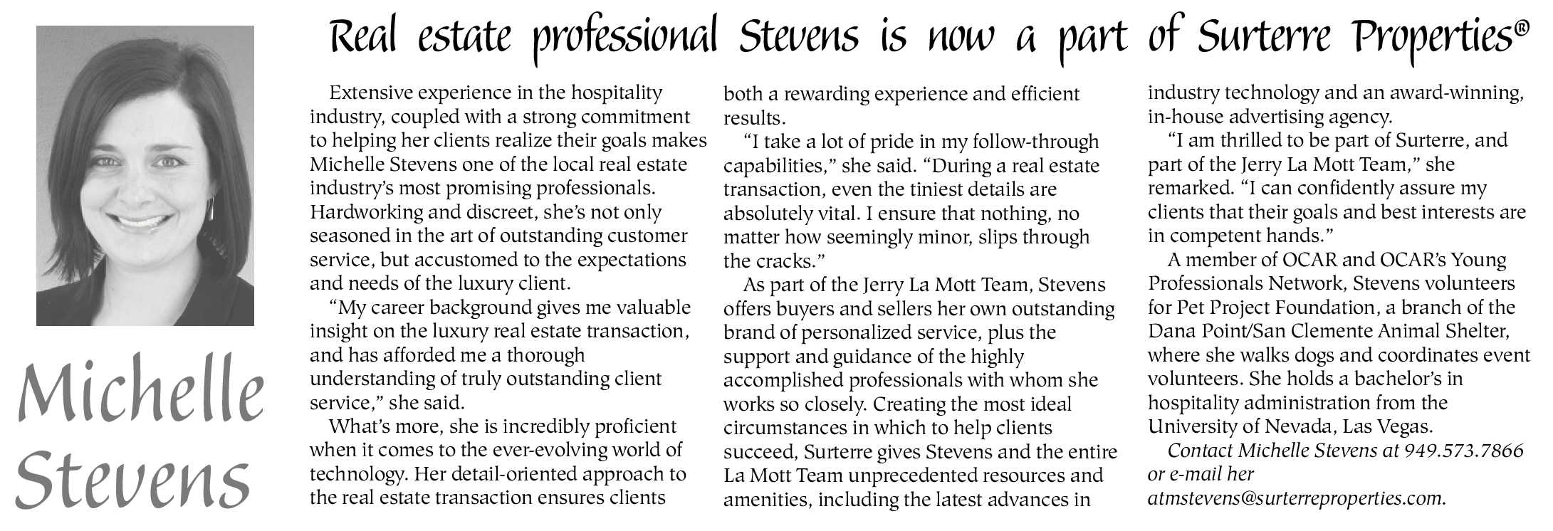 Contact Michelle Stevens at 949.573.7866 or e-mail her atmstevens@surterreproperties.com.