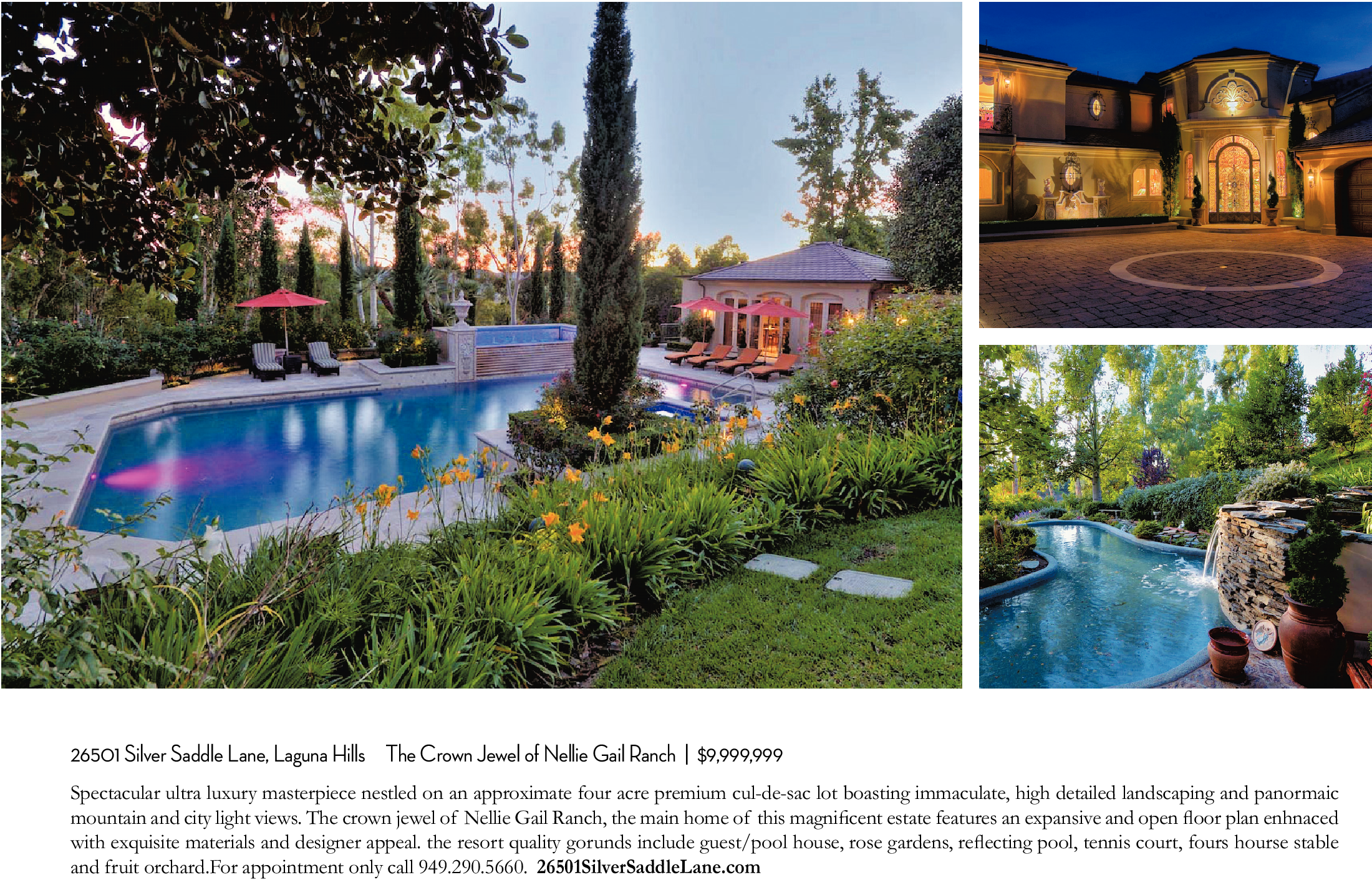 26501 Silver Saddle Lane, Laguna Hills The Crown Jewel of Nellie Gail Ranch | $9,999,999 Spectacular ultra luxury masterpiece nestled on an approximate four acre premium cul-de-sac lot boasting immaculate, high detailed landscaping and panormaic mountain and city light views. The crown jewel of Nellie Gail Ranch, the main home of this magnificent estate features an expansive and open floor plan enhnaced with exquisite materials and designer appeal. the resort quality gorunds include guest/pool house, rose gardens, reflecting pool, tennis court, fours hourse stable and fruit orchard.For appointment only call 949.290.5660. 26501SilverSaddleLane.com