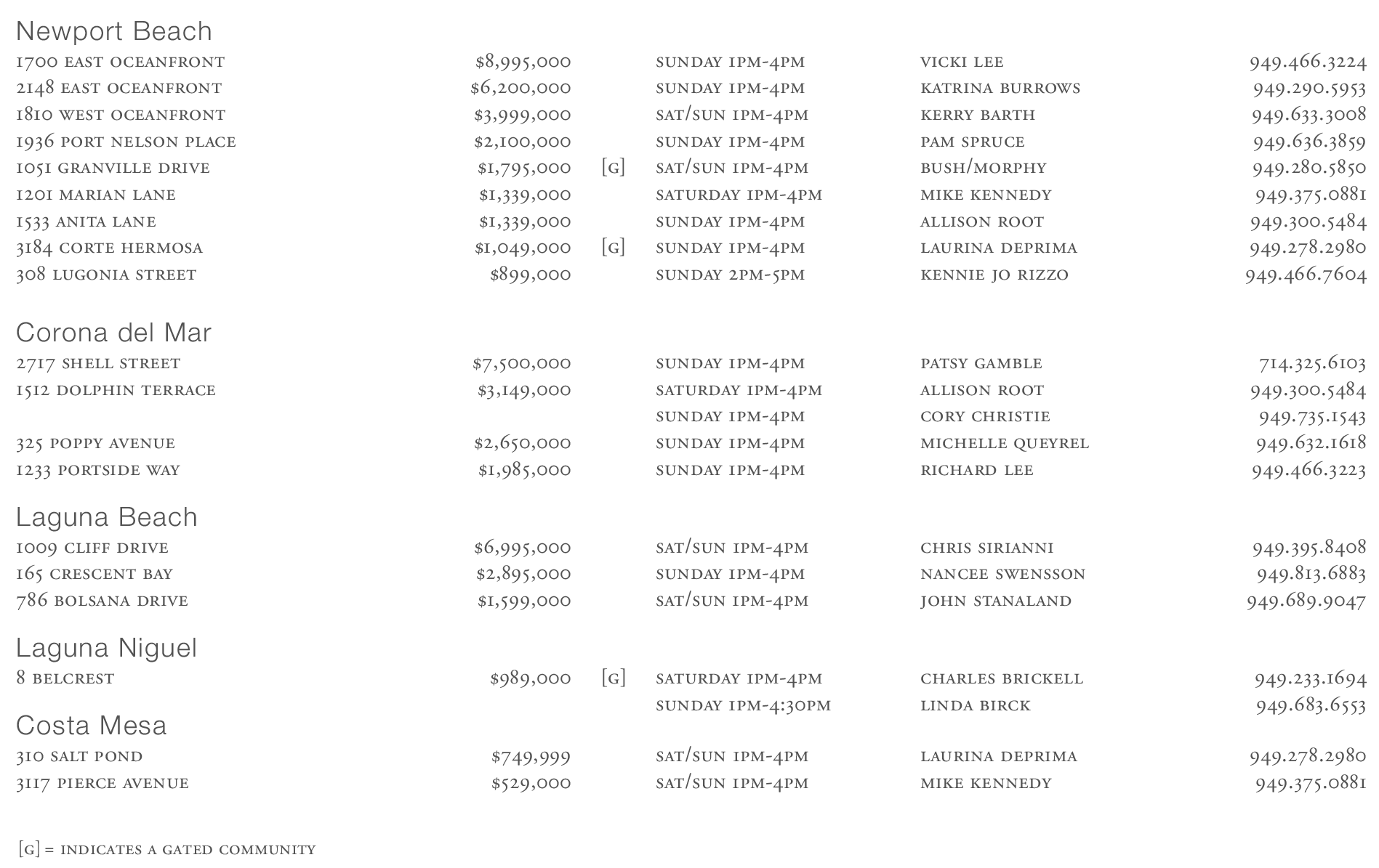 Newport Beach 1700 east oceanfront $8,995,000 sunday 1pm-4pm vicki lee 949.466.3224 2148 east oceanfront $6,200,000 sunday 1pm-4pm katrina burrows 949.290.5953 1810 west oceanfront $3,999,000 sat/sun 1pm-4pm kerry barth 949.633.3008 1936 port nelson place $2,100,000 sunday 1pm-4pm pam spruce 949.636.3859 1051 granville drive $1,795,000 [g] sat/sun 1pm-4pm bush/morphy 949.280.5850 1201 marian lane $1,339,000 saturday 1pm-4pm mike kennedy 949.375.0881 1533 anita lane $1,339,000 sunday 1pm-4pm allison root 949.300.5484 3184 corte hermosa $1,049,000 [g] sunday 1pm-4pm laurina deprima 949.278.2980 308 lugonia street $899,000 sunday 2pm-5pm kennie jo rizzo 949.466.7604