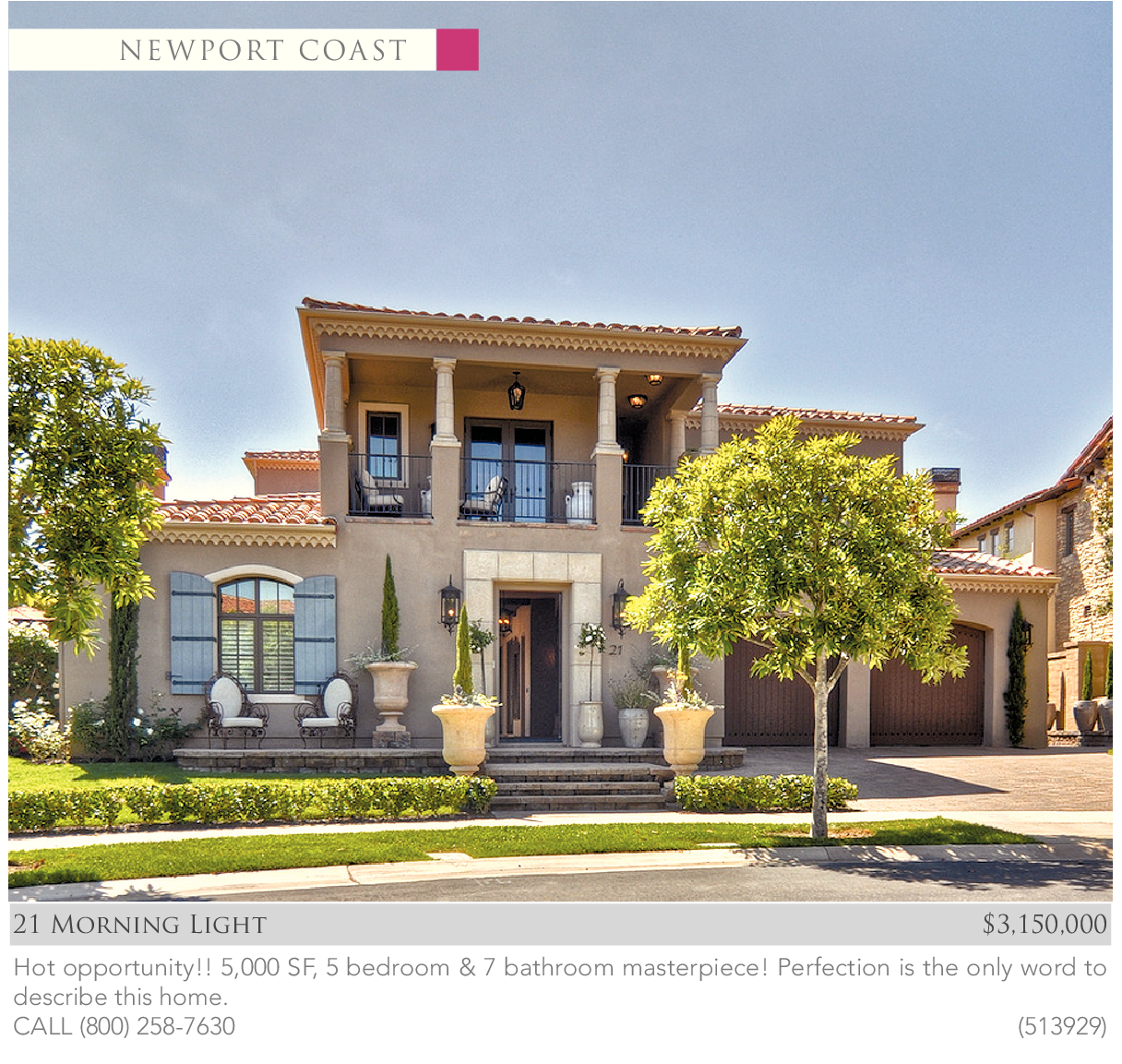 Hot opportunity!! 5,000 SF, 5 bedroom & 7 bathroom masterpiece! Perfection is the only word to describe this home. CALL (800) 258-7630 (513929)