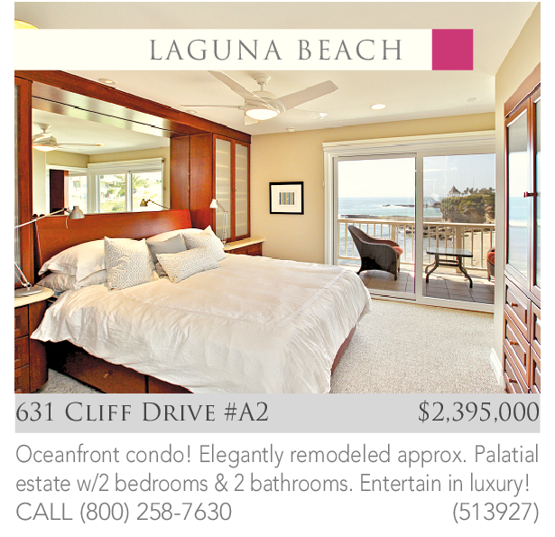 631 Cliff Drive #A2 $2,395,000 Oceanfront condo! Elegantly remodeled approx. Palatial estate w/2 bedrooms & 2 bathrooms. Entertain in luxury! CALL (800) 258-7630 (513927)