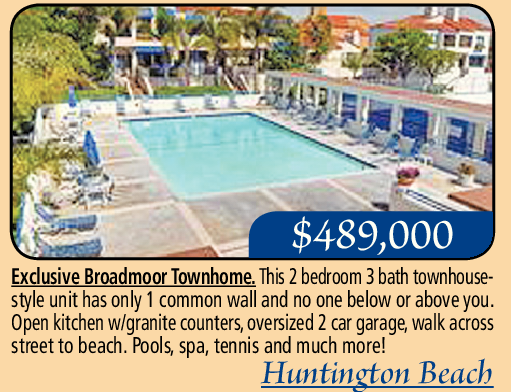 $489,000 Exclusive Broadmoor Townhome. This 2 bedroom 3 bath townhousestyle unit has only 1 common wall and no one below or above you. Open kitchen w/granite counters, oversized 2 car garage, walk across street to beach. Pools, spa, tennis and much more! Huntington Beach