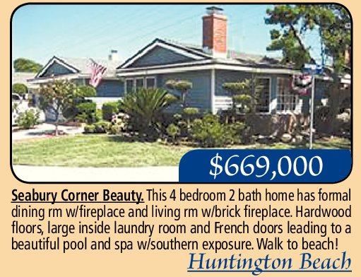 $669,000 Seabury Corner Beauty. This 4 bedroom 2 bath home has formal dining rm w/fireplace and living rm w/brick fireplace. Hardwood floors, large inside laundry room and French doors leading to a beautiful pool and spa w/southern exposure. Walk to beach! Huntington Beach