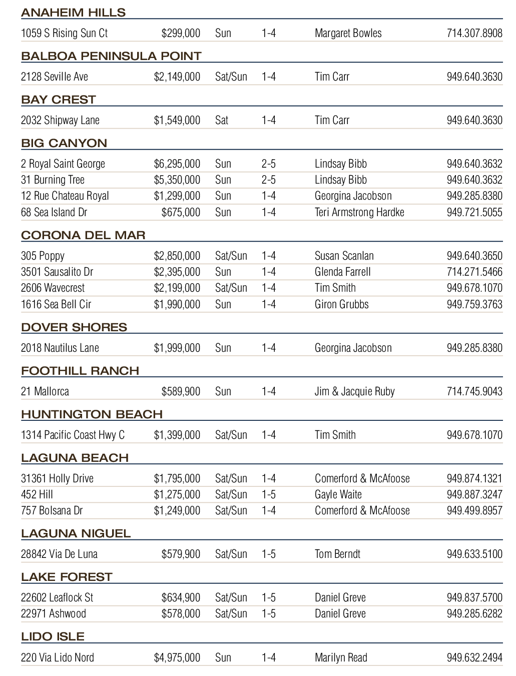 CORONA DEL MAR 305 Poppy $2,850,000 Sat/Sun 1-4 Susan Scanlan 949.640.3650 3501 Sausalito Dr $2,395,000 Sun 1-4 Glenda Farrell 714.271.5466 2606 Wavecrest $2,199,000 Sat/Sun 1-4 Tim Smith 949.678.1070 1616 Sea Bell Cir $1,990,000 Sun 1-4 Giron Grubbs 949.759.3763