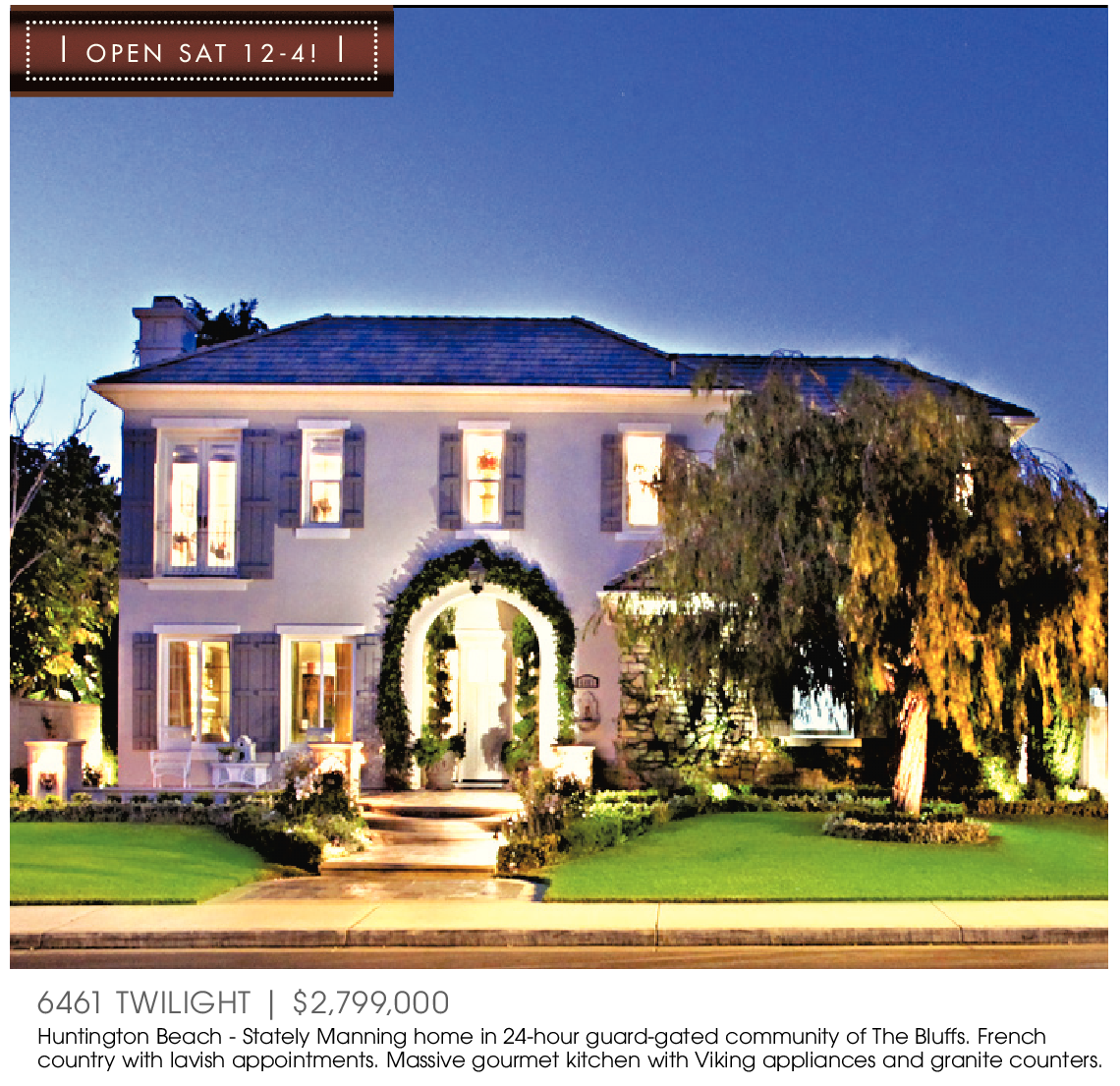 6461 TWILIGHT | $2,799,000 Huntington Beach - Stately Manning home in 24-hour guard-gated community of The Bluffs. French country with lavish appointments. Massive gourmet kitchen with Viking appliances and granite counters.