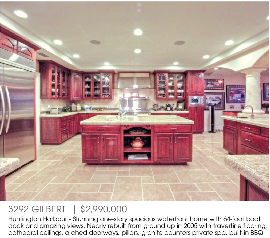 3292 GILBERT | $2,990,000 Huntington Harbour - Stunning one-story spacious waterfront home with 64-foot boat dock and amazing views. Nearly rebuilt from ground up in 2005 with travertine flooring, cathedral ceilings, arched doorways, pillars, granite counters private spa, built-in BBQ.