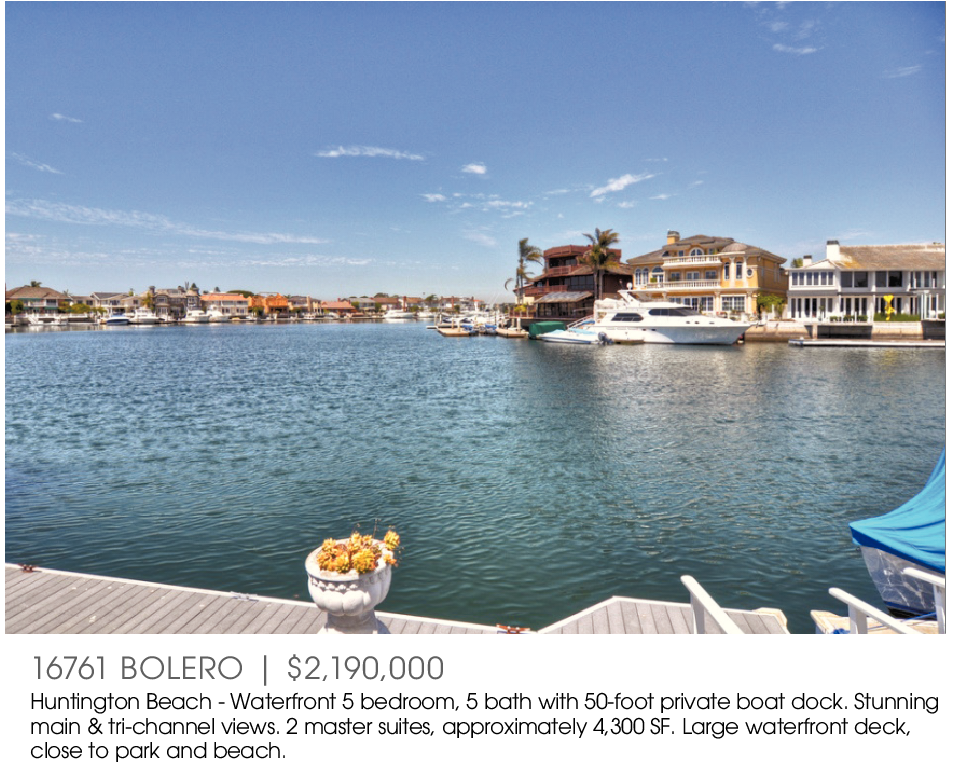 16761 BOLERO | $2,190,000 Huntington Beach - Waterfront 5 bedroom, 5 bath with 50-foot private boat dock. Stunning main & tri-channel views. 2 master suites, approximately 4,300 SF. Large waterfront deck, close to park and beach.