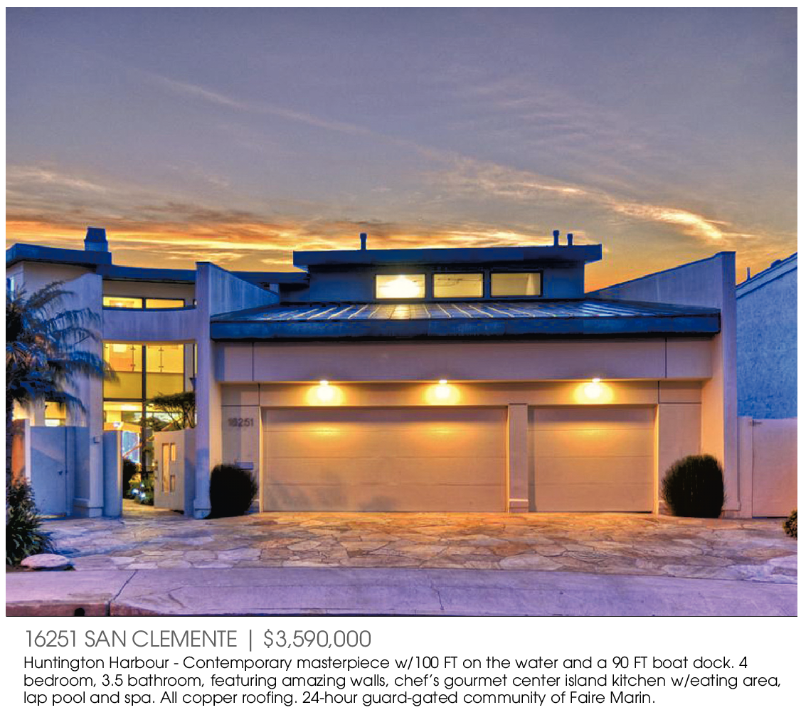 16251 SAN CLEMENTE | $3,590,000 Huntington Harbour - Contemporary masterpiece w/100 FT on the water and a 90 FT boat dock. 4 bedroom, 3.5 bathroom, featuring amazing walls, chef’s gourmet center island kitchen w/eating area, lap pool and spa. All copper roofing. 24-hour guard-gated community of Faire Marin.