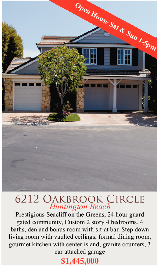6212 Oakbrook Circle Huntington Beach Prestigious Seacliff on the Greens, 24 hour guard gated community, Custom 2 story 4 bedrooms, 4 baths, den and bonus room with sit-at bar. Step down living room with vaulted ceilings, formal dining room, gourmet kitchen with center island, granite counters, 3 car attached garage $1,445,000
