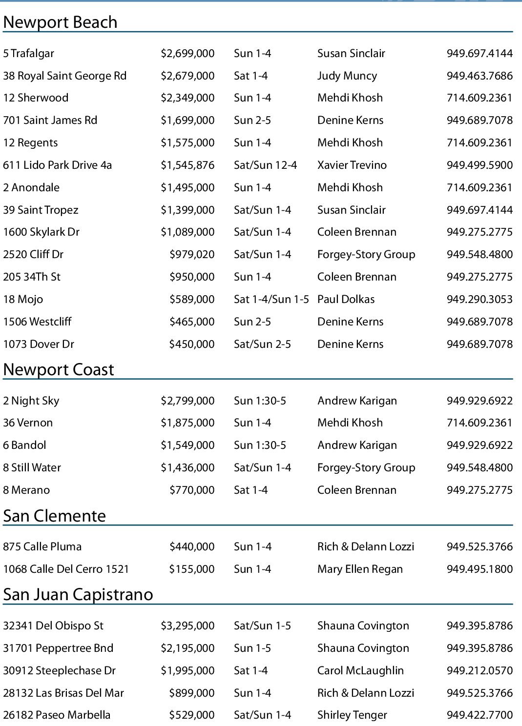 5 Trafalgar $2,699,000 Sun 1-4 Susan Sinclair 949.697.4144 38 Royal Saint George Rd $2,679,000 Sat 1-4 Judy Muncy 949.463.7686 12 Sherwood $2,349,000 Sun 1-4 Mehdi Khosh 714.609.2361 701 Saint James Rd $1,699,000 Sun 2-5 Denine Kerns 949.689.7078 12 Regents $1,575,000 Sun 1-4 Mehdi Khosh 714.609.2361 611 Lido Park Drive 4a $1,545,876 Sat/Sun 12-4 Xavier Trevino 949.499.5900 2 Anondale $1,495,000 Sun 1-4 Mehdi Khosh 714.609.2361 39 Saint Tropez $1,399,000 Sat/Sun 1-4 Susan Sinclair 949.697.4144 1600 Skylark Dr $1,089,000 Sat/Sun 1-4 Coleen Brennan 949.275.2775 2520 Cliff Dr $979,020 Sat/Sun 1-4 Forgey-Story Group 949.548.4800 205 34Th St $950,000 Sun 1-4 Coleen Brennan 949.275.2775 18 Mojo $589,000 Sat 1-4/Sun 1-5 Paul Dolkas 949.290.3053 1506 Westcliff $465,000 Sun 2-5 Denine Kerns 949.689.7078 1073 Dover Dr $450,000 Sat/Sun 2-5 Denine Kerns 949.689.7078