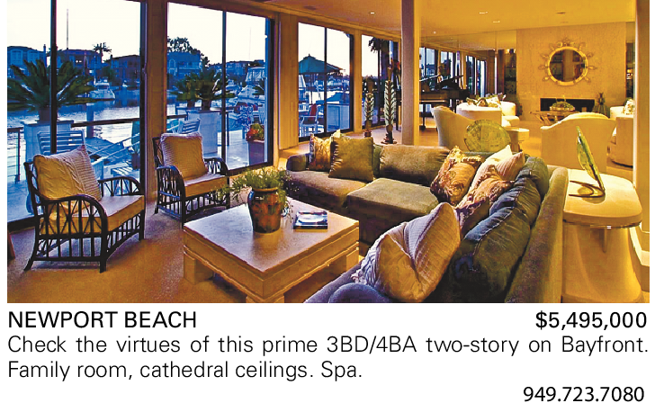 NEWPORT BEACH $5,495,000 Check the virtues of this prime 3BD/4BA two-story on Bayfront. Family room, cathedral ceilings. Spa.