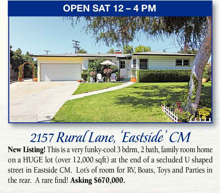 OPEN SAT 12 – 4 PM 2157 Rural Lane, ‘Eastside’ CM New Listing! This is a very funky-cool 3 bdrm, 2 bath, family room home on a HUGE lot (over 12,000 sqft) at the end of a secluded U shaped street in Eastside CM. Lot’s of room for RV, Boats, Toys and Parties in the rear. A rare find! Asking $670,000. See also