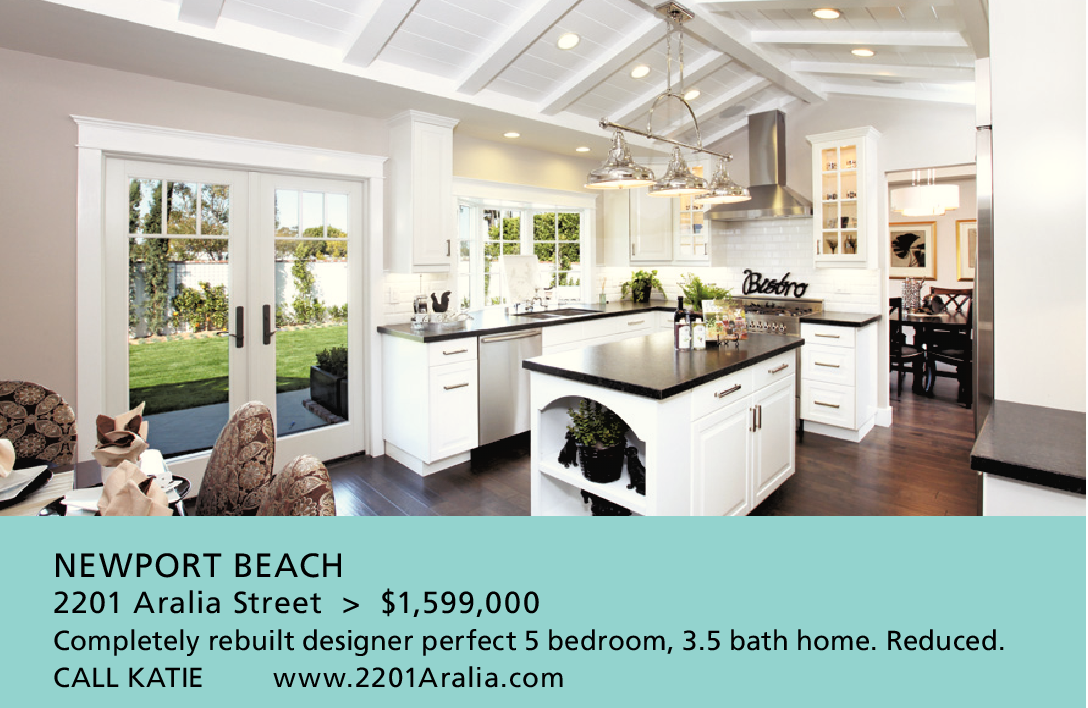 NEWPORT BEACH 2201 Aralia Street > $1,599,000 Completely rebuilt designer perfect 5 bedroom, 3.5 bath home. Reduced. CALL KATIE www.2201Aralia.com