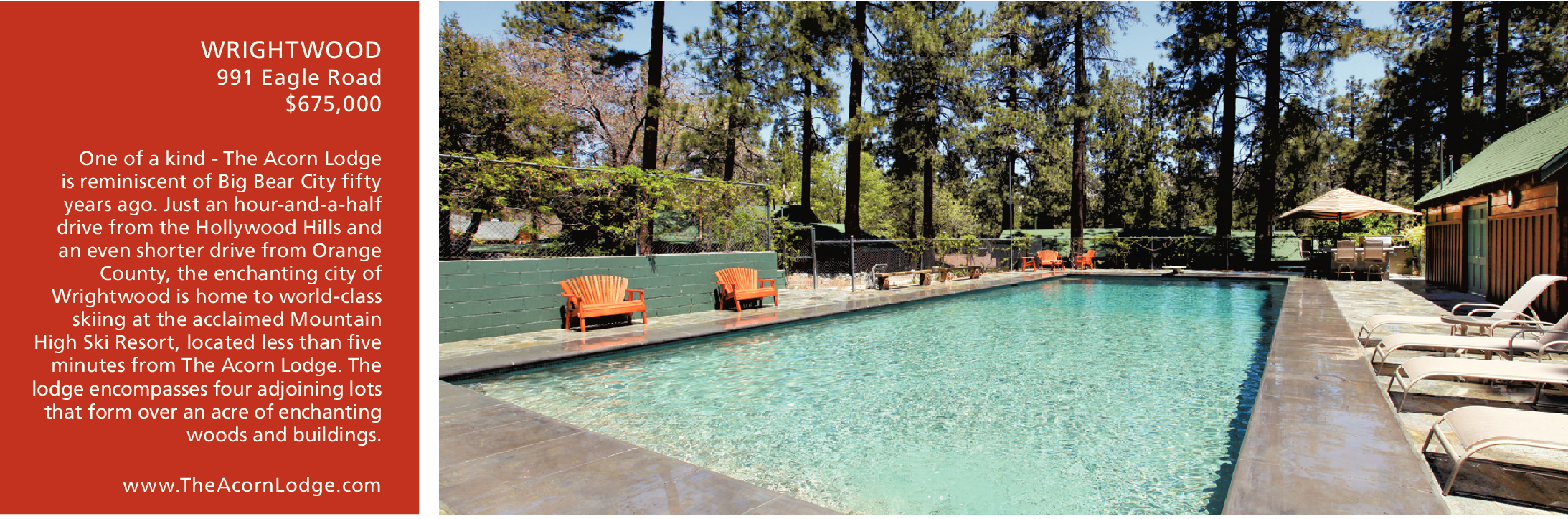 WRIGHTWOOD 991 Eagle Road $675,000 One of a kind - The Acorn Lodge is reminiscent of Big Bear City fifty years ago. Just an hour-and-a-half drive from the Hollywood Hills and an even shorter drive from Orange County, the enchanting city of Wrightwood is home to world-class skiing at the acclaimed Mountain High Ski Resort, located less than five minutes from The Acorn Lodge. The lodge encompasses four adjoining lots that form over an acre of enchanting woods and buildings. www.TheAcornLodge.com