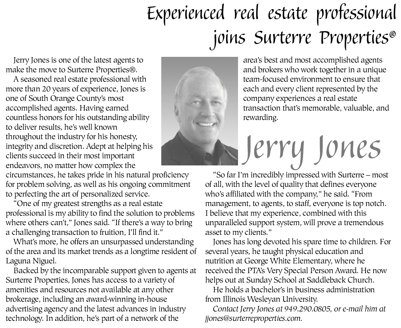 Contact Jerry Jones at 949.290.0805, or e-mail him at jjones@surterreproperties.com.