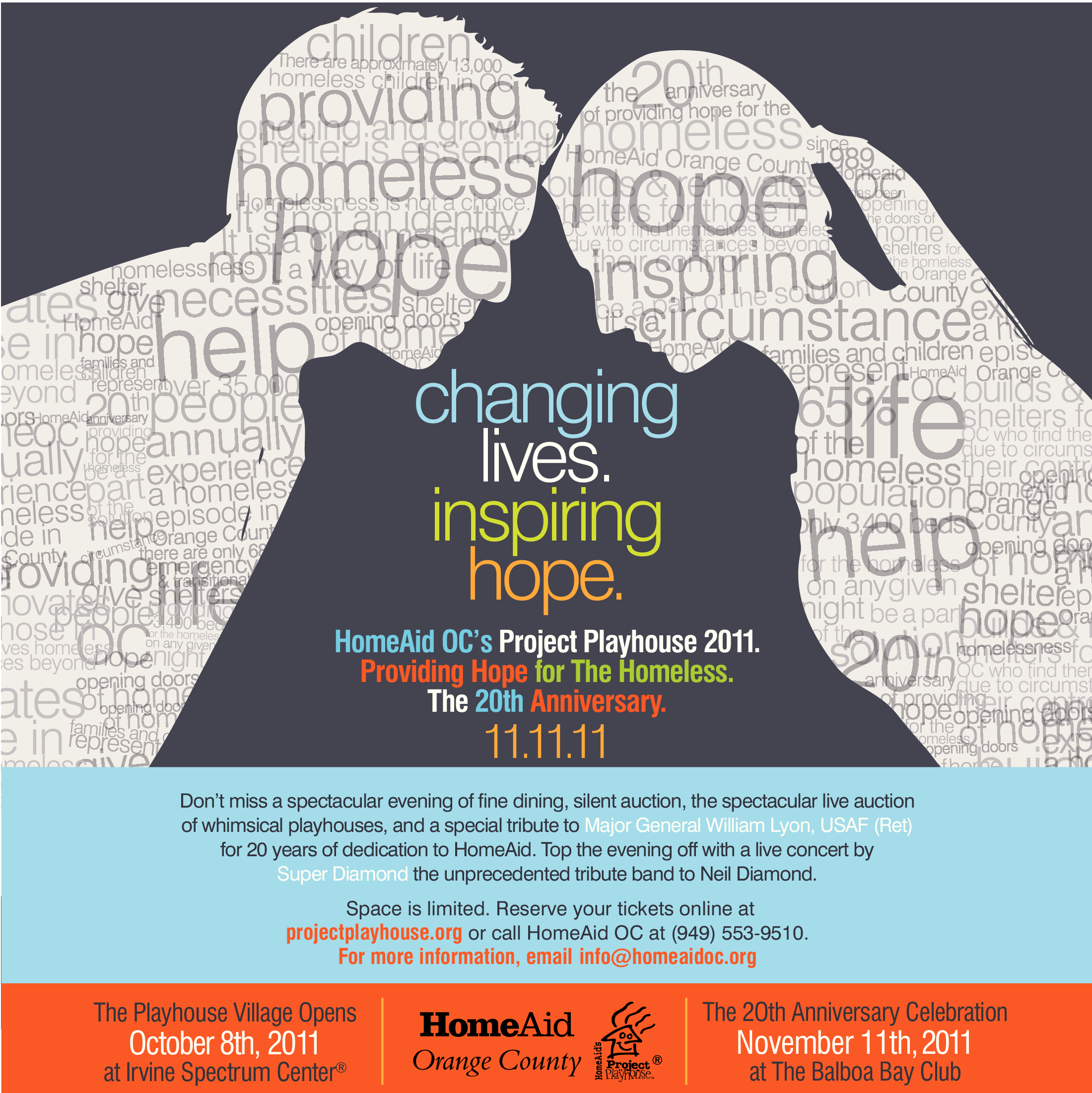 Don’t miss a spectacular evening of fine dining, silent auction, the spectacular live auction of whimsical playhouses, and a special tribute to Major General William Lyon, USAF (Ret) for 20 years of dedication to HomeAid. Top the evening off with a live concert by Super Diamond the unprecedented tribute band to Neil Diamond.