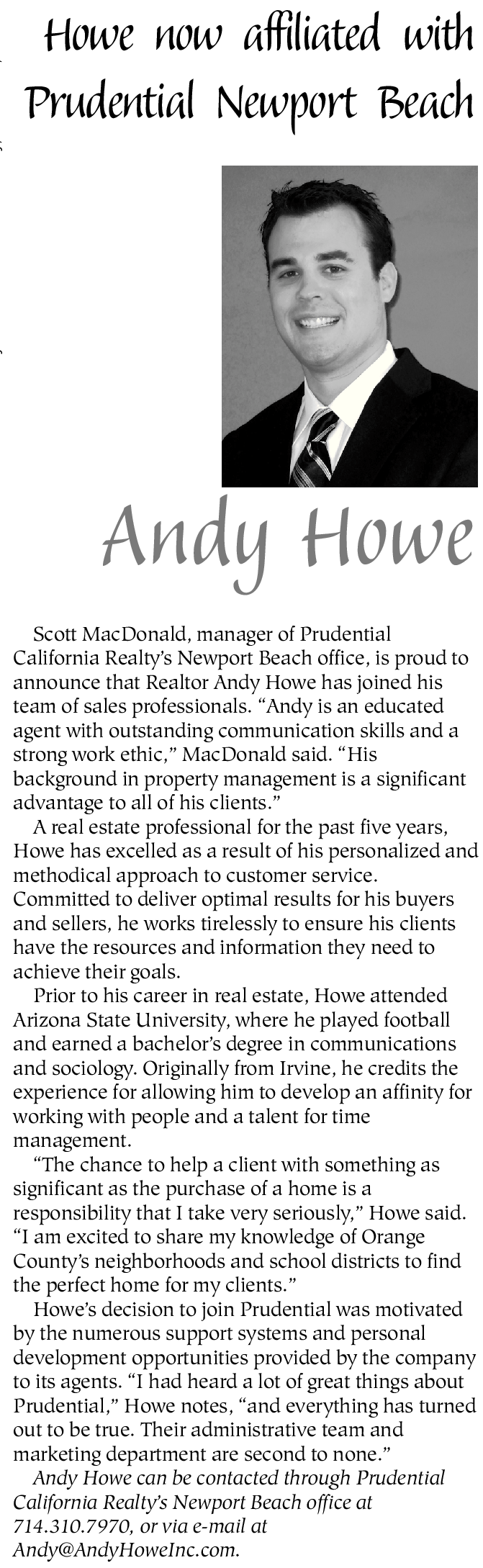 Howe now affiliated with Prudential Newport Beach Andy Howe Scott MacDonald, manager of Prudential California Realty’s Newport Beach office, is proud to announce that Realtor Andy Howe has joined his team of sales professionals. “Andy is an educated agent with outstanding communication skills and a strong work ethic,” MacDonald said. “His background in property management is a significant advantage to all of his clients.” A real estate professional for the past five years, Howe has excelled as a result of his personalized and methodical approach to customer service. Committed to deliver optimal results for his buyers and sellers, he works tirelessly to ensure his clients have the resources and information they need to achieve their goals. Prior to his career in real estate, Howe attended Arizona State University, where he played football and earned a bachelor’s degree in communications and sociology. Originally from Irvine, he credits the experience for allowing him to develop an affinity for working with people and a talent for time management. “The chance to help a client with something as significant as the purchase of a home is a responsibility that I take very seriously,” Howe said. “I am excited to share my knowledge of Orange County’s neighborhoods and school districts to find the perfect home for my clients.” Howe’s decision to join Prudential was motivated by the numerous support systems and personal development opportunities provided by the company to its agents. “I had heard a lot of great things about Prudential,” Howe notes, “and everything has turned out to be true. Their administrative team and marketing department are second to none.” Andy Howe can be contacted through Prudential California Realty’s Newport Beach office at 714.310.7970, or via e-mail at Andy@AndyHoweInc.com.