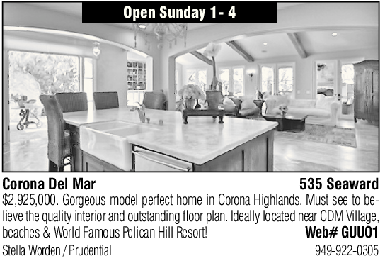 Open Sunday 1- 4 Corona Del Mar 535 Seaward $2,925,000. Gorgeous model perfect home in Corona Highlands. Must see to believe the quality interior and outstanding floor plan. Ideally located near CDM Village, beaches & World Famous Pelican Hill Resort! Web# GUUO1 Stella Worden / Prudential 949-922-0305 See also