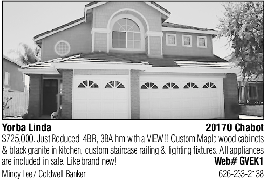 Yorba Linda 20170 Chabot $725,000. Just Reduced! 4BR, 3BA hm with a VIEW !! Custom Maple wood cabinets & black granite in kitchen, custom staircase railing & lighting fixtures. All appliances are included in sale. Like brand new! Web# GVEK1 Minoy Lee / Coldwell Banker 626-233-2138