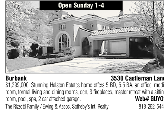 Open Sunday 1-4 Burbank 3530 Castleman Lane $1,299,000. Stunning Halston Estates home offers 5 BD, 5.5 BA, an office, media room, formal living and dining rooms, den, 3 fireplaces, master retreat with a sitting room, pool, spa, 2 car attached garage. Web# GUYO1 The Rizzotti Family / Ewing & Assoc. Sotheby’s Int. Realty 818-262-5446 See also