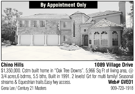 By Appointment Only Chino Hills 1089 Village Drive $1,350,000. Cstm built home in “Oak Tree Downs”. 5,966 Sq Ft of living area, @ 3/4 acres,6 bdrms, 5.5 bths, Built in 1991. 2 levels! Grt for multi family! Seasonal streams & Equestrian trails.Easy fwy access. Web# GVEO1 Gena Lee / Century 21 Masters 909-720-1918