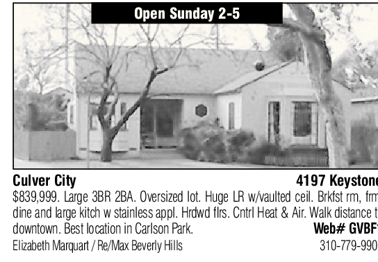 Culver City 4197 Keystone $839,999. Large 3BR 2BA. Oversized lot. Huge LR w/vaulted ceil. Brkfst rm, frml downtown. Best location in Carlson Park. Web# GVBF1 dine and large kitch w stainless appl. Hrdwd flrs. Cntrl Heat & Air. Walk distance to Elizabeth Marquart / Re/Max Beverly Hills 310-779-9908