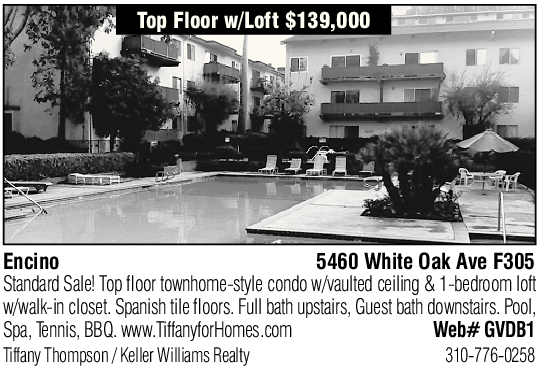 Top Floor w/Loft $139,000 Encino 5460 White Oak Ave F305 Standard Sale! Top floor townhome-style condo w/vaulted ceiling & 1-bedroom loft w/walk-in closet. Spanish tile floors. Full bath upstairs, Guest bath downstairs. Pool, Spa, Tennis, BBQ. www.TiffanyforHomes.com Web# GVDB1 Tiffany Thompson / Keller Williams Realty 310-776-0258