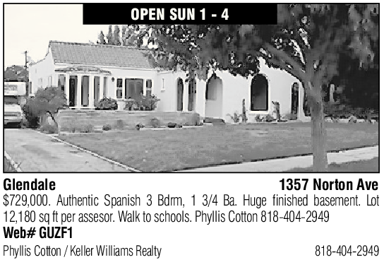 OPEN SUN 1 - 4 Glendale 1357 Norton Ave $729,000. Authentic Spanish 3 Bdrm, 1 3/4 Ba. Huge finished basement. Lot 12,180 sq ft per assesor. Walk to schools. Phyllis Cotton 818-404-2949 Web# GUZF1 Phyllis Cotton / Keller Williams Realty 818-404-2949 See also