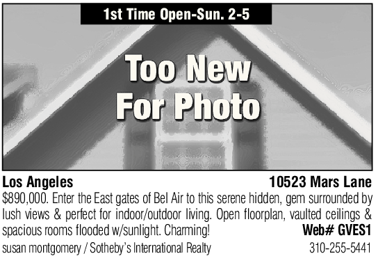 1st Time Open-Sun. 2-5 Los Angeles 10523 Mars Lane $890,000. Enter the East gates of Bel Air to this serene hidden, gem surrounded by lush views & perfect for indoor/outdoor living. Open floorplan, vaulted ceilings & spacious rooms flooded w/sunlight. Charming! Web# GVES1 susan montgomery / Sotheby’s International Realty 310-255-5441