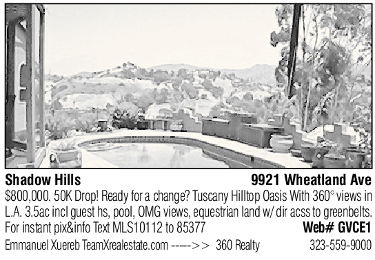 Shadow Hills 9921 Wheatland Ave $800,000. 50K Drop! Ready for a change? Tuscany Hilltop Oasis With 360° views in L.A. 3.5ac incl guest hs, pool, OMG views, equestrian land w/ dir acss to greenbelts. For instant pix&info Text MLS10112 to 85377 Web# GVCE1 Emmanuel Xuereb TeamXrealestate.com ----->> 360 Realty 323-559-9000