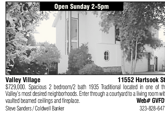 Open Sunday 2-5pm Valley Village 11552 Hartsook St. $729,000. Spacious 2 bedroom/2 bath 1935 Traditional located in one of the Valley’s most desired neighborhoods. Enter through a courtyard to a living room with vaulted beamed ceilings and fireplace. Web# GVFD1 Steve Sanders / Coldwell Banker 323-828-6471