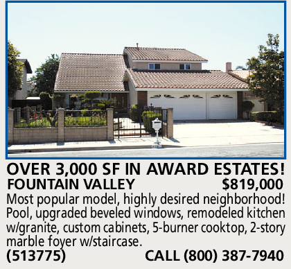 FOUNTAIN VALLEY $819,000 Most popular model, highly desired neighborhood! Pool, upgraded beveled windows, remodeled kitchen w/granite, custom cabinets, 5-burner cooktop, 2-story marble foyer w/staircase. (513775) CALL (800) 387-7940