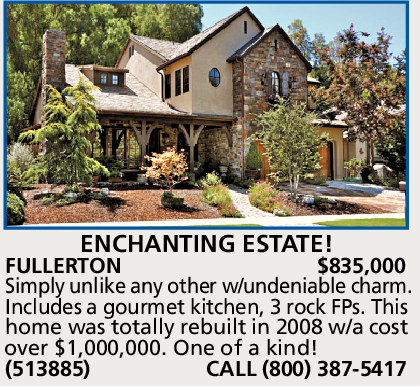 FULLERTON $835,000 Simply unlike any other w/undeniable charm. Includes a gourmet kitchen, 3 rock FPs. This home was totally rebuilt in 2008 w/a cost over $1,000,000. One of a kind!