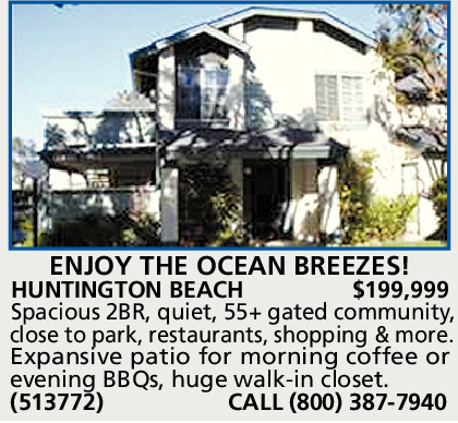 HUNTINGTON BEACH $199,999 Spacious 2BR, quiet, 55+ gated community, close to park, restaurants, shopping & more.
