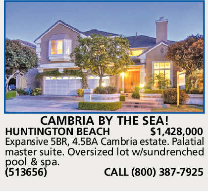 HUNTINGTON BEACH $1,428,000 Expansive 5BR, 4.5BA Cambria estate. Palatial master suite. Oversized lot w/sundrenched pool & spa. (513656) CALL (800) 387-7925