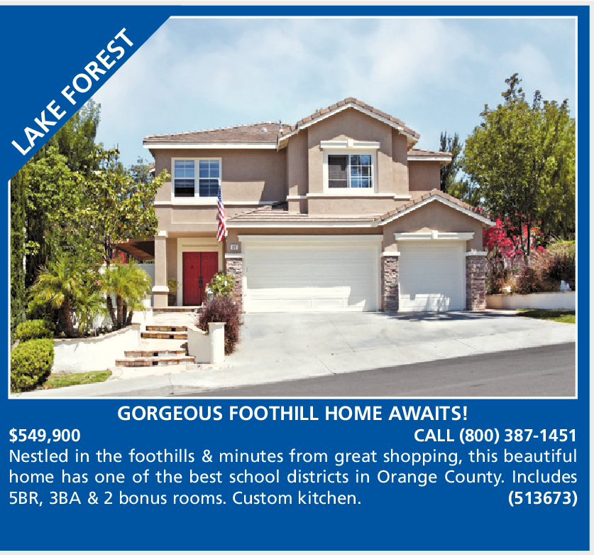 GORGEOUS FOOTHILL HOME AWAITS! $549,900 CALL (800) 387-1451 Nestled in the foothills & minutes from great shopping, this beautiful home has one of the best school districts in Orange County. Includes 5BR, 3BA & 2 bonus rooms. Custom kitchen. (513673)