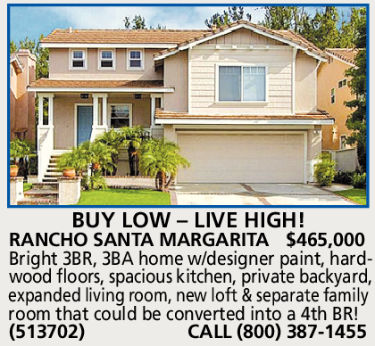 BUY LOW – LIVE HIGH! RANCHO SANTA MARGARITA $465,000 Bright 3BR, 3BA home w/designer paint, hardwood floors, spacious kitchen, private backyard, expanded living room, new loft & separate family room that could be converted into a 4th BR! (513702) CALL (800) 387-1455