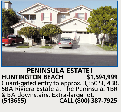 HUNTINGTON BEACH $1,594,999 Guard-gated entry to approx. 3,350 SF, 4BR, 5BA Riviera Estate at The Peninsula. 1BR & BA downstairs. Extra-large lot.