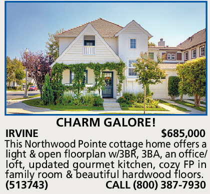 IRVINE $685,000 This Northwood Pointe cottage home offers a light & open floorplan w/3BR, 3BA, an office/ loft, updated gourmet kitchen, cozy FP in family room & beautiful hardwood floors. (513743) CALL (800) 387-7930