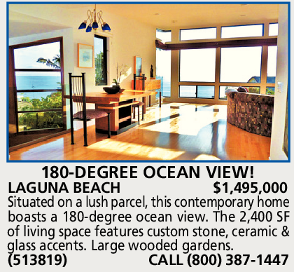 180-DEGREE OCEAN VIEW! LAGUNA BEACH $1,495,000 Situated on a lush parcel, this contemporary home boasts a 180-degree ocean view. The 2,400 SF of living space features custom stone, ceramic & glass accents. Large wooded gardens. (513819) CALL (800) 387-1447
