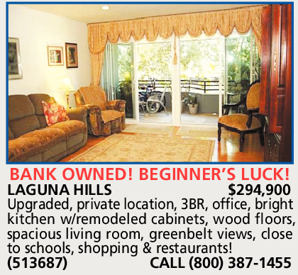 BANK OWNED! BEGINNER’S LUCK! LAGUNA HILLS $294,900 Upgraded, private location, 3BR, office, bright kitchen w/remodeled cabinets, wood floors, spacious living room, greenbelt views, close to schools, shopping & restaurants! (513687) CALL (800) 387-1455