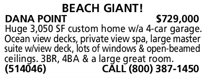 DANA POINT $729,000 Huge 3,050 SF custom home w/a 4-car garage. Ocean view decks, private view spa, large master suite w/view deck, lots of windows & open-beamed ceilings. 3BR, 4BA & a large great room. (514046) CALL (800) 387-1450