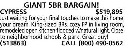 GIANT 5BR BARGAIN! CYPRESS $519,895 Just waiting for your final touches to make this home your dream. King-sized BRs, cozy FP in living room, remodeled open kitchen flooded w/natural light. Close to neighborhood schools & park. Great buy! (513863) CALL (800) 490-0562