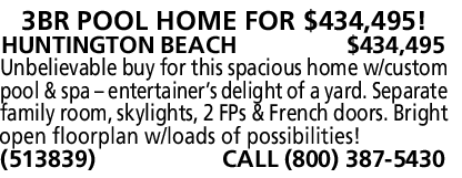 3BR POOL HOME FOR $434,495! HUNTINGTON BEACH $434,495 Unbelievable buy for this spacious home w/custom pool & spa – entertainer’s delight of a yard. Separate family room, skylights, 2 FPs & French doors. Bright open floorplan w/loads of possibilities! (513839) CALL (800) 387-5430