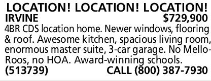LOCATION! LOCATION! LOCATION! IRVINE $729,900 4BR CDS location home. Newer windows, flooring & roof. Awesome kitchen, spacious living room, enormous master suite, 3-car garage. No Mello- Roos, no HOA. Award-winning schools. (513739) CALL (800) 387-7930