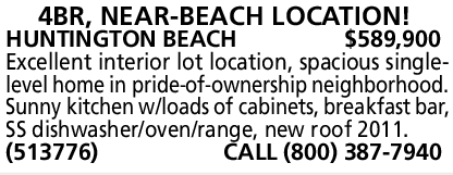 4BR, NEAR-BEACH LOCATION! HUNTINGTON BEACH $589,900 Excellent interior lot location, spacious singlelevel home in pride-of-ownership neighborhood. Sunny kitchen w/loads of cabinets, breakfast bar, SS dishwasher/oven/range, new roof 2011. (513776) CALL (800) 387-7940